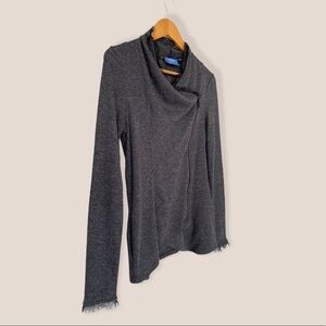 Asymmetrical grey zip up sweater with cowl neck and frayed fabric detail. In good condition. Size M.