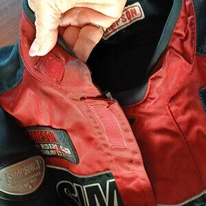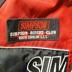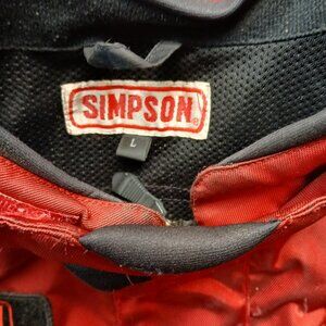 Genuine Simpson moto-racing jacket from North Carolina. The exterior and interior of the jacket are in very good condition. The last two pictures show some staining. It should be dry-cleaned to bring it back to perfection! Size tag show L (large), please refer to measurements to ensure fit.