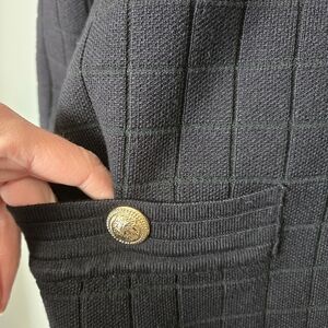 Beautiful black checkered cardigan with ornate gold lion buttons. Two front pockets. Full front buttoned closure.