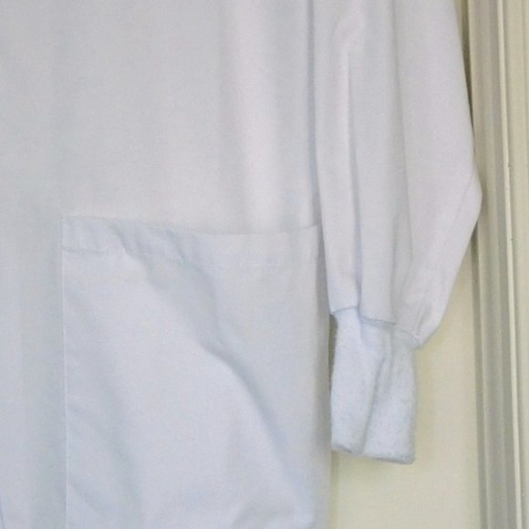 This lab coat has a round neck opening, snap buttons and 2 large pockets. The long sleeves have knitted fabric cuffs. It has not been worn often. There is some minor pilling of the knit fabric on the cuffs but that is the only indication that it has been worn. It is sized a US Small. To me it looks like it would fit a US 6 - 8.