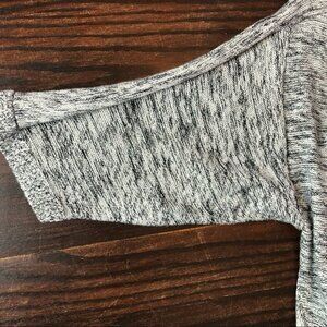 Heathered grey. Longer length. Short sleeves.