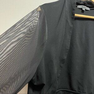 Pre owned. Great condition. Black bolero with sheer sleeves. Open front. Cropped. Rayon, nylon & spandex