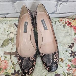 These shoes from SJP are a classic pump with a low block heel and almond toe. They have a Python embossed print in the leather. They are in good used condition with light wear at sole and scuffs at the left toe.