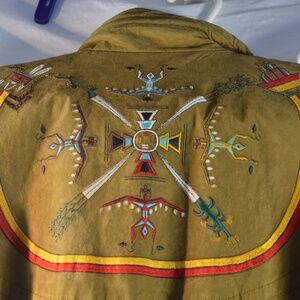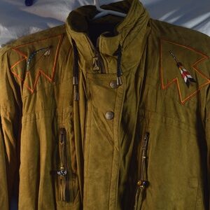 Beautifully embroidered Ski Jacket on Shammy soft fabric. Tag does not say so I believe this is a faux fabric resembling suede. It's a size 6 but fits big. The sleeves are not traditional sleeves so there is lots of room in it. By Skea.