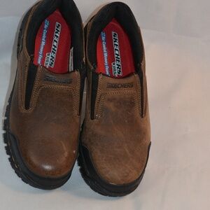 Brand New in Box. Men's Sz 8 Sketchers Slip on step; toe work shoes with Air Cooled memory foam and anti slip soles.