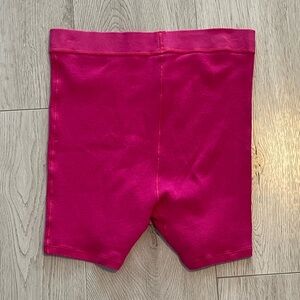 Skims Cotton Rib Boxer in raspberry- a hot pink fuschia. Ribbed fitted boxer style shorts with a matching elastic logo waistband in a softy stretchy cotton ribbed jersey. High rise and mid length. Wear as shorts or alone as underwear.