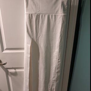 Elegant white swim coverup. Features a high slit for style. Perfect for beach or poolside.