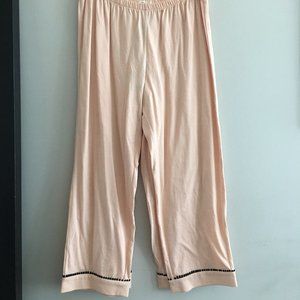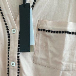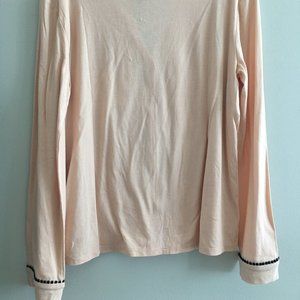 A light and luxury pink with black piping and embroidery, pocket sleeves and pant cuff .