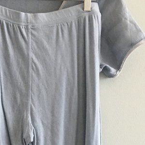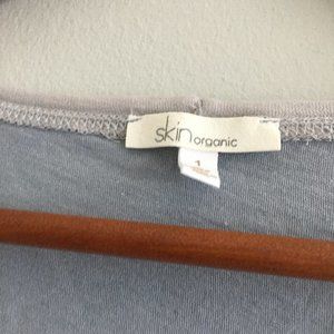 100% organic pima cotton. Beautiful luxurious soft material from skin. A very light weight light blue outer layer with the double layered cotton on the inside, white piping On top and pants.