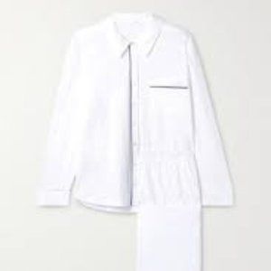 A light crisp white layer with navy piping on pocket sleeves and pant cuff .