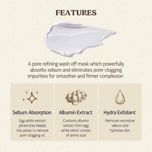 The SkinFood Egg White Pore Mask contains several key ingredients, including egg white extract (albumen), bentonite clay, and kaolin clay, all designed to purify pores and refine skin texture. It also includes ingredients like olive fruit