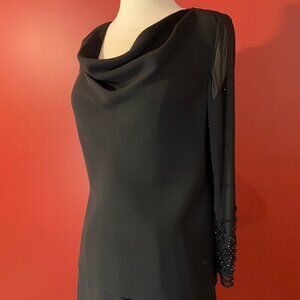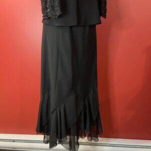 S.L. Fashions Women's Black Embellished 2-piece Outfit - Size 10 - Great preowned condition! 100% polyester. Style 196597. Embellished with beads on sheer sleeves. Ruffled skirt.