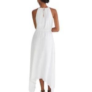 Flowy dress with cut-in shoulders and drawstring waist gets a modern update with a scarf high-low hemline. Filigree style silvertone beaded details at front keyhole, back tie and waist.