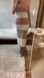 Mock turtleneck sleeveless ribbed knit dress in wide horizontal cream & tan stripes. The dress is not lined, has a demure side slit in a synthetic fabric with some stretch. The neutral colours make it an easy piece to use as a canvas to create a fit for any occasion.