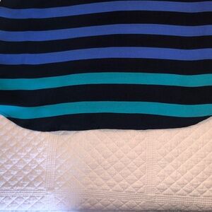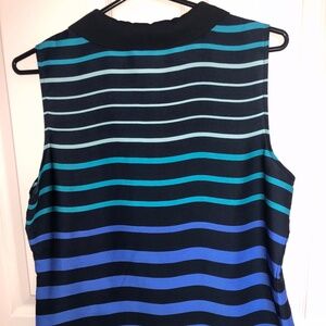 Colourful black, blue and green striped, sleeveless blouse with curved hem. Perfect to wear tucked or loose with dress pants, long shorts or jeans. Black collar and buttonhole opening with black button closure at neckline. Excellent condition! Size M