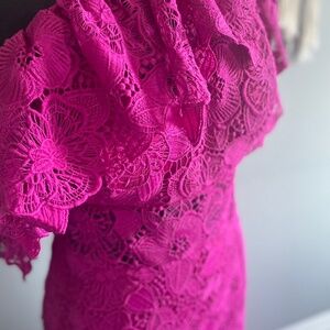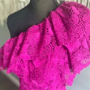 Excellent condition, worn only once! The narrow form of the asymmetric one-shoulder lace gown with a slit and modern style gives a sleek and sophisticated look. The one-shoulder design showcases a bold appearance while appealing to a feminine style. You can choose to wear this gown with high-heeled shoes on your special occasions.