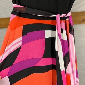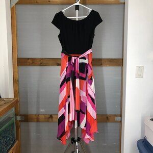 SLNY Black Scoop Neck Cap Sleeve Chiffon Multicolor Asymmetrical Maxi Dress Sz8