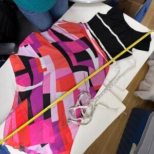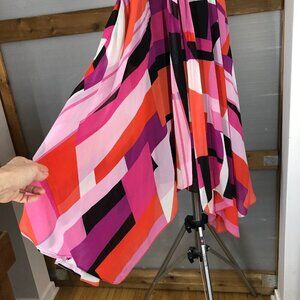 Chiffon Multi-Color Geometric Print with Asymmetrical Hemline.