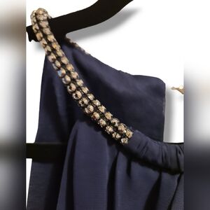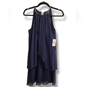 NWT SL Fashions navy blue chiffon cocktail dress. Beautiful sheer chiffon layered over a fully lined bodice & skirt. Beaded halter neckline and keyhole back for effortless chic.