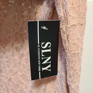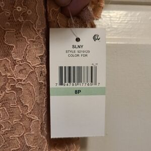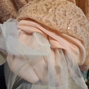 Beautiful NWT lace dress in faded rose (light pink) color. Sequins sewn throughout give it a subtle shimmer. Tulle added to the lining on the bottom for extra fullness. Hidden zipper on back. 60% Nylon 40% Rayon with 100% Polyester lining.