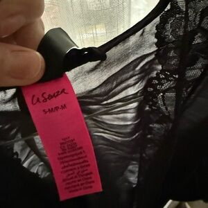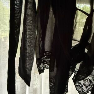 Indulge in the elegance of this La SENZA black robe, crafted with delicate lace trim and a lightweight, sheer fabric. The flowing design and open front with a tie closure create a timeless and romantic look. Perfect for adding a touch of sophistication to your intimate wardrobe.