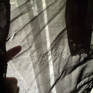 This was stored and where my finger points a hanger frayed the right side. Still good condition. Very soft and feminine.