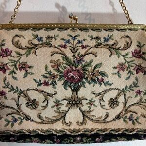 SMALL BAG Tapestry Floral Coin Closure with Rhinestone Unbranded. Lovely vintage look and feel. Golden trim and chain. Lined. Measurements in pictures. Unique statement piece.