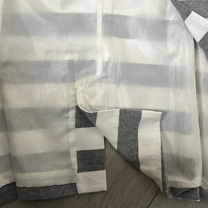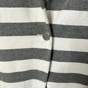 This stretchy blazer is perfect for the office. This was my fav blazer! I love the stripes and my fav color grey. It’s in beautiful condition and is fully lined with silver buttons