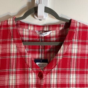 Stylish red plaid jumpsuit with long sleeves. Features a button-up front and waist tie. Super cute and cozy. Cottagecore. Athleisure at its best.