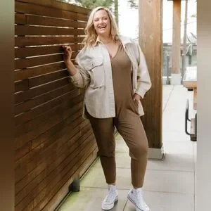 A versatile taupe jumpsuit with a flattering V-neck and tapered leg. Soft, stretch fabric for all-day comfort. Easy pull-on style with practical side pockets. Pair with a light jacket for a casual, put-together look.