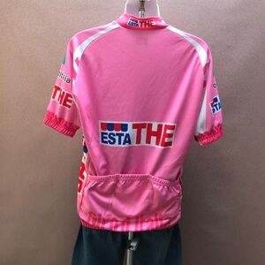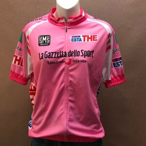 Cycling jersey made in Italy. Lightweight with rubber around the waistband and arms to prevent the shirt from riding up. Size Large