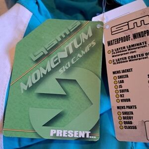 SMS men's size Large Aqua & white ski or snowboard jacket, lots of pockets with hook & loop closures as well as zippers, cuffs are adjustable, wind waist panel is removable, there are a couple faint marks on the white areas from storage, good quality jacket.
