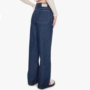 NWT utility wide leg jeans from Mother Denim. These are meant to fit low-slung on the hips for a true size 23" waist. However, for a fit on the waist, they could fit a size 24" or 25". Wash name: Cold Brew, a clean dark wash with no distressing. They feature a clean hem that "puddles" over the shoes, contrast gold stitching, a zip fly, slit pockets, and a hammer loop. Retail price: $248 CAD. Materials: 100% cotton.