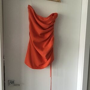 Strapless ruched mini dress. Form fitted, gathered ruching, adjustable tie on side, silicone edge at top, invisible side zipper