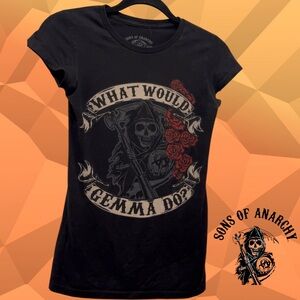 This black t-shirt features a bold graphic design, perfect for Sons fans. Comfortable and stylish for everyday wear.