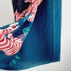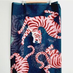 • Prowling pink tigers on dark blue background, lightweight sheer single curtain panel.