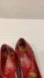 ARTSY & FUN high heeled closed toe shoes with red/black floral bead appliqué at toe. Colour is Red/Teal/Gold Metallic Multi colours. The Sole is Red Rubber Anti-Slip. I cannot confirm if leather Size 9