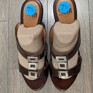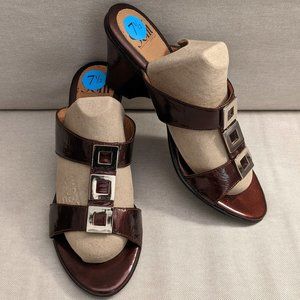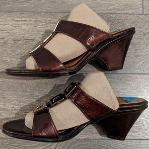 Genuine patent leather shoes in like new condition. Size 7 1/2 M. Heel height 3" (7.5 cm). Chocolate brown soft leather with golden metal square accents. Slip on open toe wedge sandals.