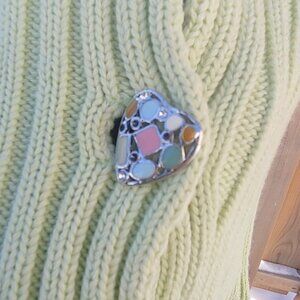 This cardigan features 3 beautiful heart shaped buttons. They are an enameled and jeweled mosaic.