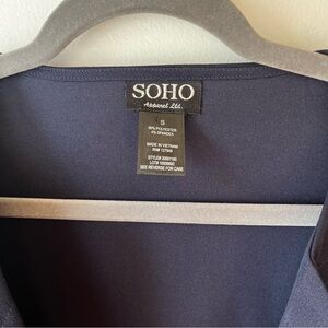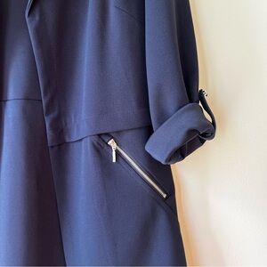 Chic and versatile navy longline blazer-style jacket by SOHO Apparel Ltd., size small. Features a flattering open front, modern zippered pockets, and roll-tab 3/4 sleeves with silver buttons. Made of a comfortable poly-spandex blend with a sleek drape—perfect for layering over office outfits or casual basics. Great for minimalist wardrobes, career looks, or capsule closets. Approx. 33” shoulder to hem. Gently used and in excellent condition.