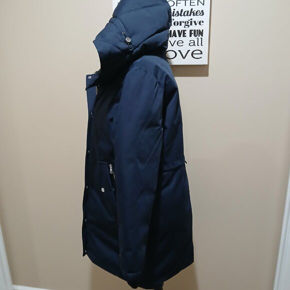 Worn only once for a brief time. I purchased this coat thinking that it was a good fit for me, but it is too small. Sadly, letting it go to a new home. Slim fit - signature fit. Hip length. Hood with adjustable elastic draw-cord plus storm visor. Center front closure with zip. Jersey knit storm cuffs with thumb holes. Pockets at chest & hip with zip closure. Polar fleece-lined pockets. Water repellent/water resistant. Up to -15 Celsius. Certified down-filled.