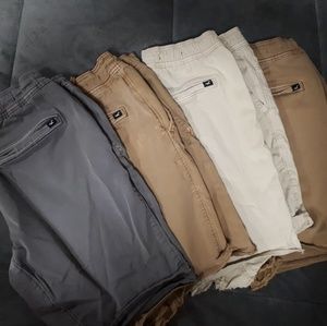 You get all 4 pair for one low price! Flat front, narrow leg, raw edge, flattering fit. Sad that Hollister doesn't make them anymore but my son has out grown these.They are well loved and worn and need ironing, and 3 pair have slight discolouration spots that I tried to capture in pics. Otherwise, good condition, no tears or worn out seams. Get ALL 4 for 15 bucks, or bundle them to get a 15% discount. Still super cool. Smoke free home.