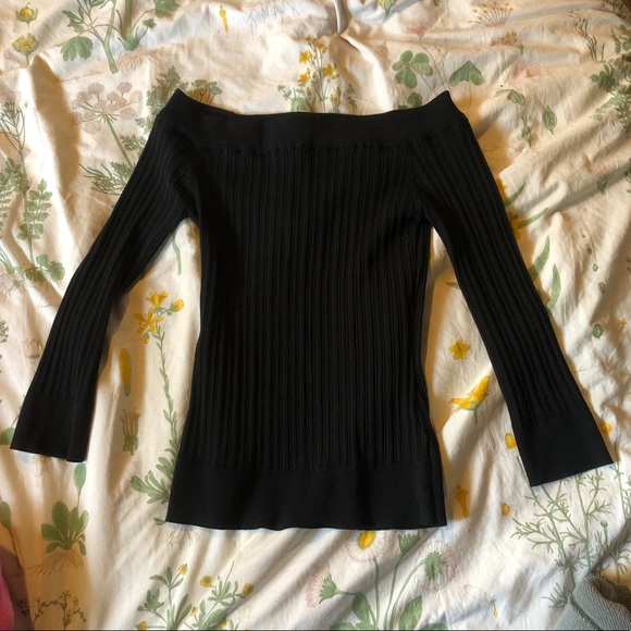 Black, ribbed, 3/4 sleeve, off the shoulder top from Dynamite. Such a cute basic to have!