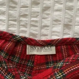 red, green and yellow plaid print, mid rise, with a slight flare