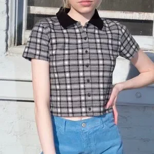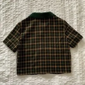 short sleeve button up, features a collar and buttons up. slightly cropped