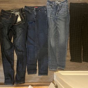 Jeans from AE and Guess size 2 and 26 jeans from Abercrombie. Size 6 AE jeans. Dynamite dress XS and Suzy Shier pants size XS. Used but like new.