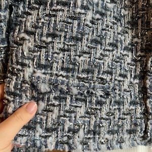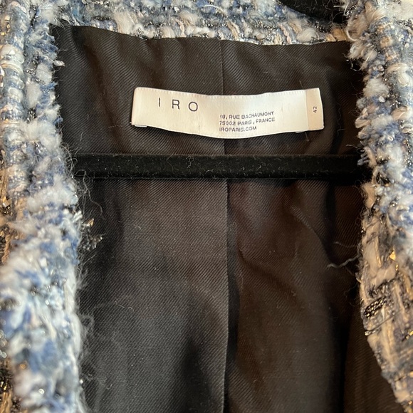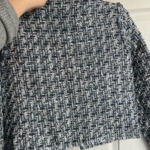 France size 42. Fits a m or L. Cropped style. Has shoulder pads. Tweed blue with metallic threads. Really good condition
