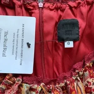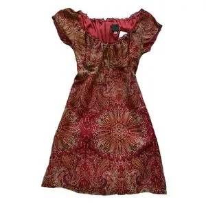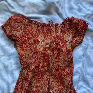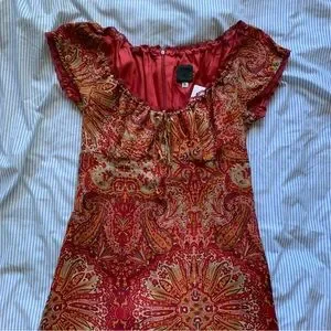 trendy milkmaid style red dress, with a beautiful paisley pattern throughout!! lots of cute details like a tie front bust and red lace trim