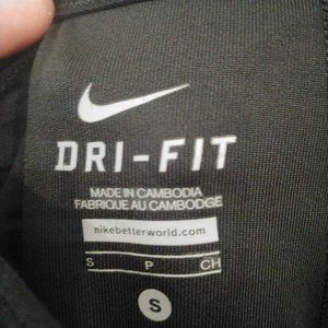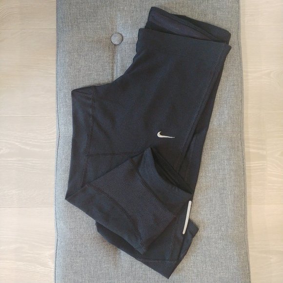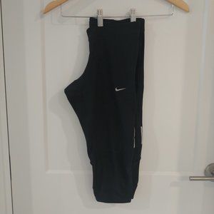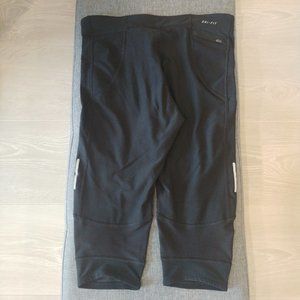 Women's Dri-fit Nike capri leggings in size small. Two pockets and two reflective stripes. They fall right below the knee for length. Good used condition. No fading, just the light in the pics. One tiny blemish on one reflective stripe, as shown in pics. Inner fabric tag removed.