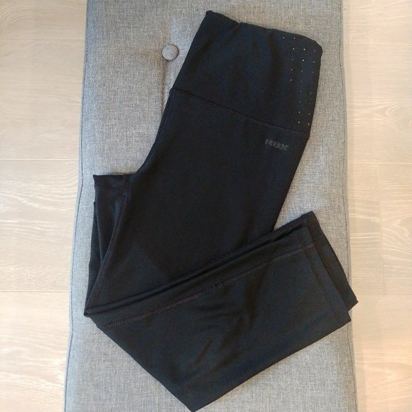 Women's RBX 7/8 length activewear leggings in size small. These fall just a few inches above the ankle for length. Hardly worn. Still have embroidery from tags on them, but no actual tags. They are high-waisted and very flattering. Cute aerated cut-outs with a cream/neutral colour that peeks through. Great condition. No fading, just the light in the pics. Stitching is a little irregular/crooked on some parts of the seams, as expected with a cheaper brand. Blemish shown in pics is on the inside of the waistband from a QC sticker that was removed upon purchase.